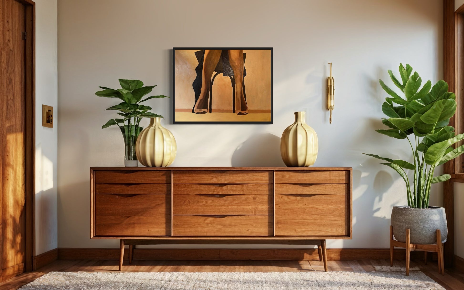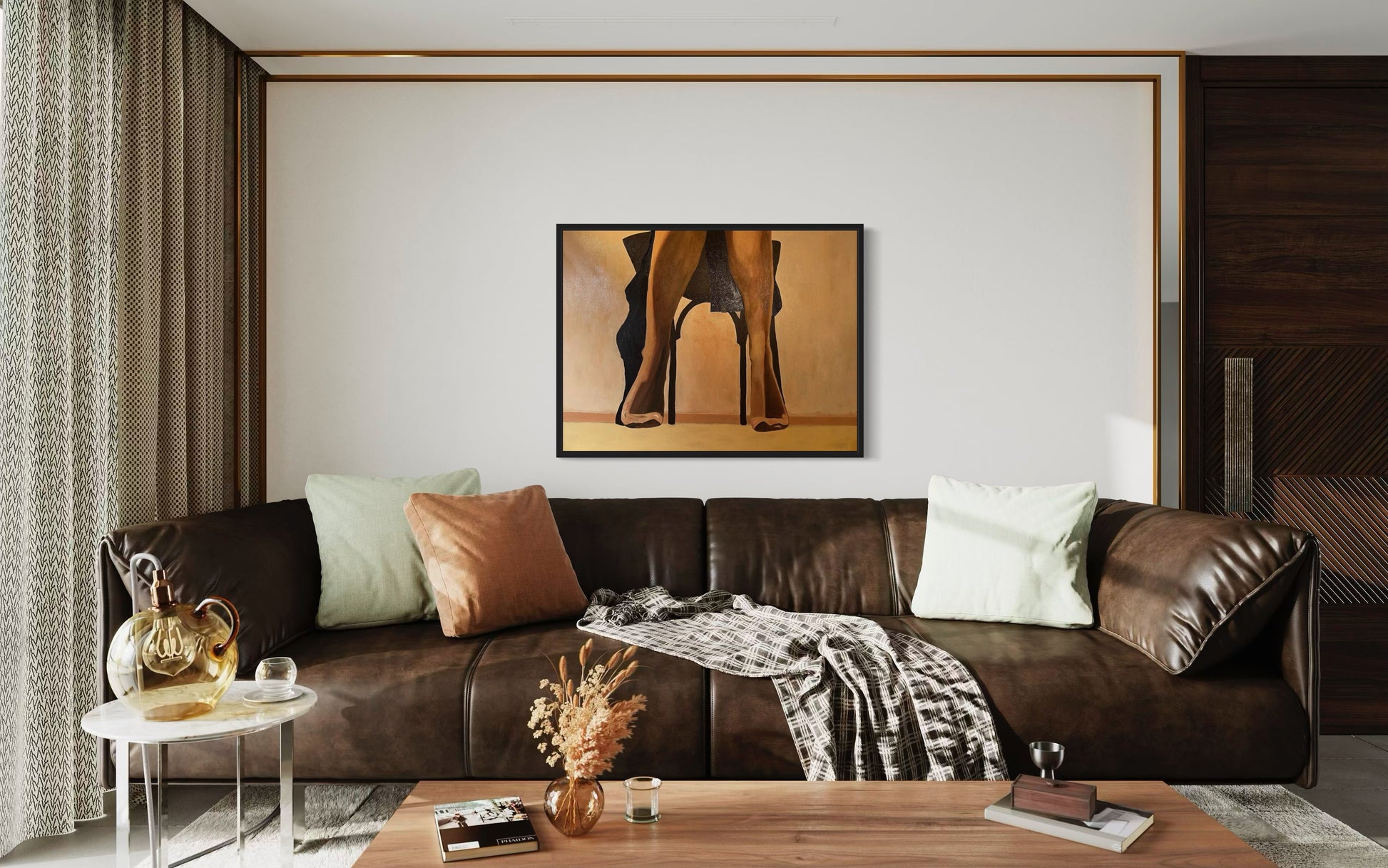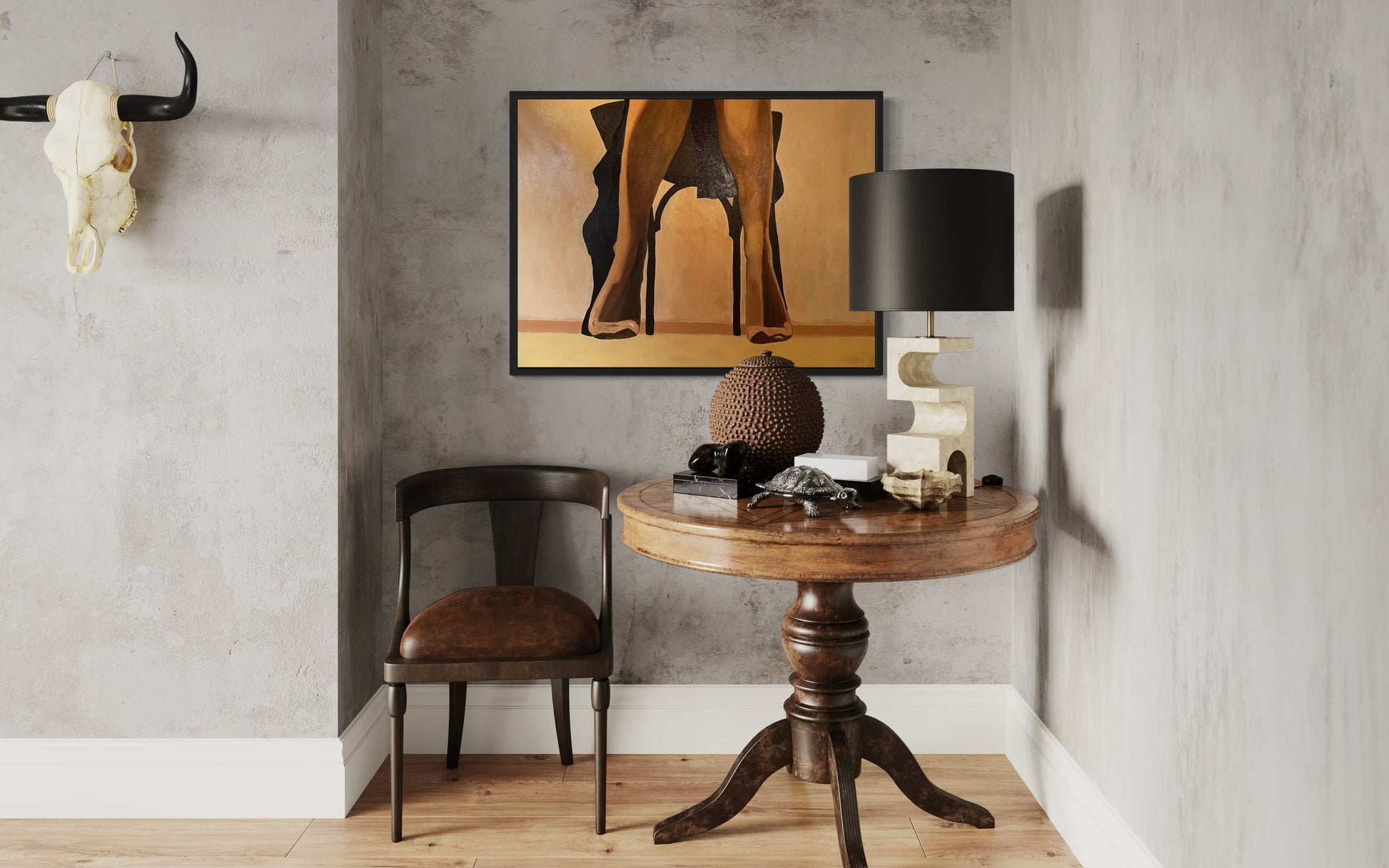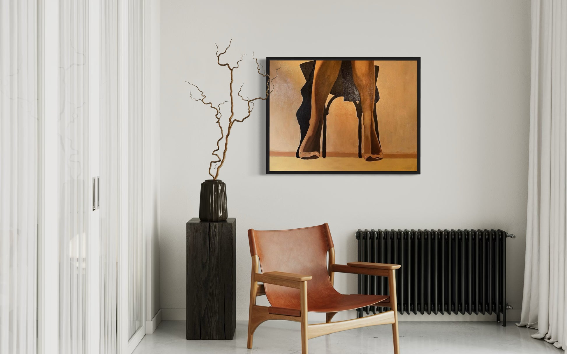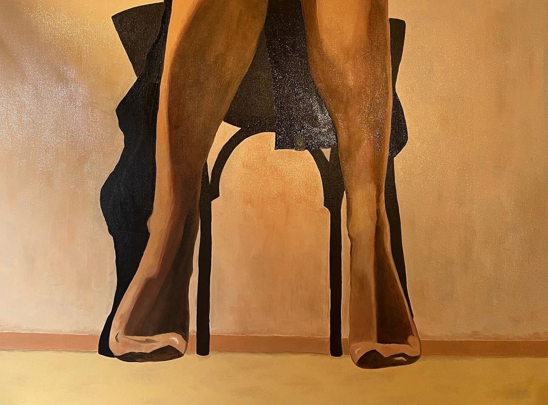 “Quiet Allure” oil painting captures an intimate moment, focusing on the lower half of a woman seated on a chair. Only her legs, clad in sheer hosiery, are visible from the knees down, exuding a quiet sensuality. A dark coat drapes loosely over the sides of the chair, its folds adding depth and texture to the scene. Rendered in muted tones of black and yellow ochre, the soft light creates a play of shadows that gently embraces the figure, evoking a sense of mystery and introspection. The painting invites viewers to imagine the unseen, hinting at the story beyond the frame.